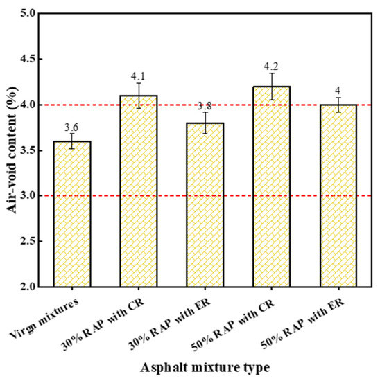 There is a method of evaluating the workability of asphalt mixtures in compaction process, which is determined with the use of air void content of specimens produced with Marshall compactor [25,29]. The better workability of asphalt mixtures can be obtained if the air void content is lower. In this study, Marshall specimens were firstly prepared following mix design in Table 4. Then, the air void contents of these specimens were tested to assess the workability. The detailed procedures are as follows.