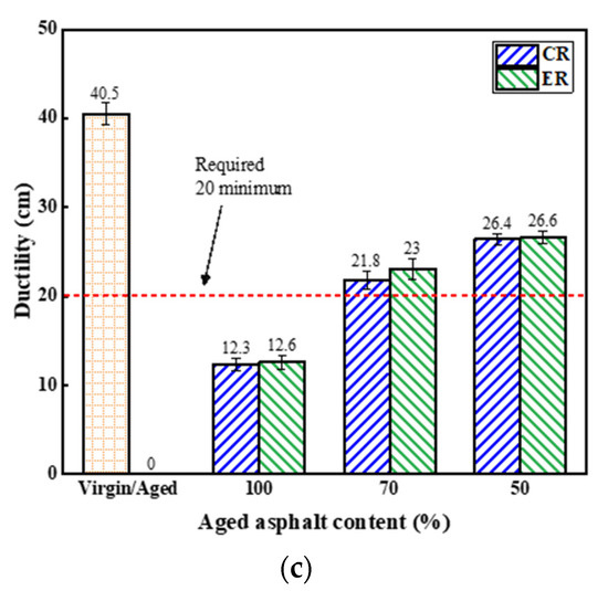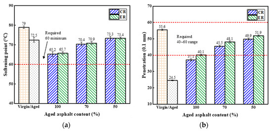 Test results of three indexes of different asphalt binders are shown in Figure 7. It was found that after long-term aging, the softening point, penetration and ductility of virgin asphalt all decreased. With the incorporation of rejuvenators into the aged asphalt, the softening point decreased, and the penetration and ductility increased. This indicates the performances of the aged asphalt had been partially recovered. However, three indexes of recycled asphalt were difficult to meet the requirements in JTG-F40 specification [32] simultaneously when only rejuvenator was added. In the case of the addition of rejuvenator and virgin asphalt, aged asphalt content can reach to 70% in view of the fact that these indexes of recycled asphalt all satisfied the requirements. In addition, the values of three indexes of recycled asphalt with ER were equivalent to that of recycled asphalt with CR. This may be attributed to complete dissipation of moisture during the preparation process of recycled asphalt or little residual water that basically had no effect on the properties of recycled asphalt [33].