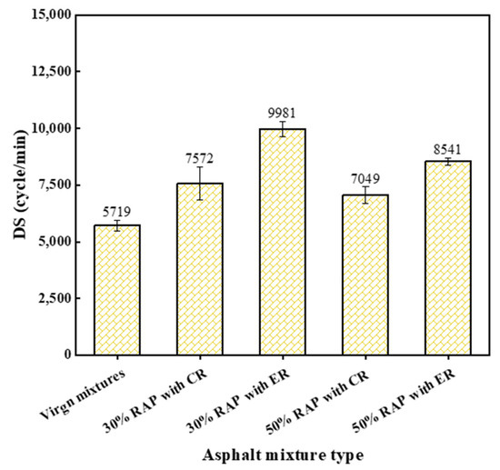 The dynamic stability (DS) results of each studied mixture are presented in Figure 8. The higher DS means the better high-temperature stability. As can be found in this figure, the DS values of all reclaimed mixtures were higher than that of the virgin mixture. However, the DS values of reclaimed mixtures did not vary monotonously with the increasing RAP content. The sample with 30% RAP content had the highest DS. Among these reclaimed mixtures, the mix with CR showed lower DS than the mix with ER, indicating that using ER in reclaimed mixtures results in better high-temperature stability. It was found above that the use of ER improved the workability of reclaimed mixtures, which results in lower air void content in reclaimed mixtures (see Figure 6). This may be the reason why better high-temperature stability of reclaimed mixture with ER was obtained.