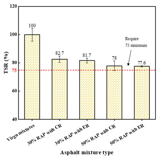 Figure 9 shows the tensile strength ratio (TSR) of the mixtures. Obviously, the TSR of reclaimed mixtures was lower than that of virgin mixtures, indicating that the use of RAP in asphalt mixtures is adverse to the moisture sensibility. There are two probable factors contributing to the worse moisture susceptibility of reclaimed mixtures. The first is that low surface free energy of aged asphalt weakens the bond between aggregates and aged asphalt [34]. The aged asphalt strips from the RAP particles with more ease under the freeze-thaw condition, which results in the water damage. The second can be that the incomplete blending between virgin asphalt and aged asphalt yields a weak interface, and water damage tends to occur at this interface easily [35]. The reclaimed mixtures with ER exhibited the nearly equivalent TSR to that with CR, although water was induced in ER. Overall, all studied mixtures had good moisture susceptibility, because these specimens showed TSR values beyond the requirements in Chinese JTG-F40 specification.