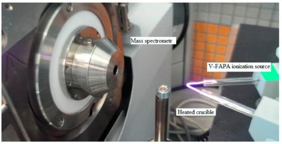 The flowing atmospheric-pressure afterglow (FAPA) ion source for mass spectrometry was used to generate plasma, allowing the ionization of analyte particles released thermally from a heated crucible with temperature regulation from 20 to 400 °C, at a temperature increase rate of 3 °C s−1 (Figure 1). The temperature of the maximum desorption of the analyte was 340 ± 10 °C. The mini crucible allowing the temperature-controlled desorption was placed ca. 10 mm below the ion stream. The distance between the inlet to the mass spectrometer and the FAPA ion source was about 10 cm [31,32].
