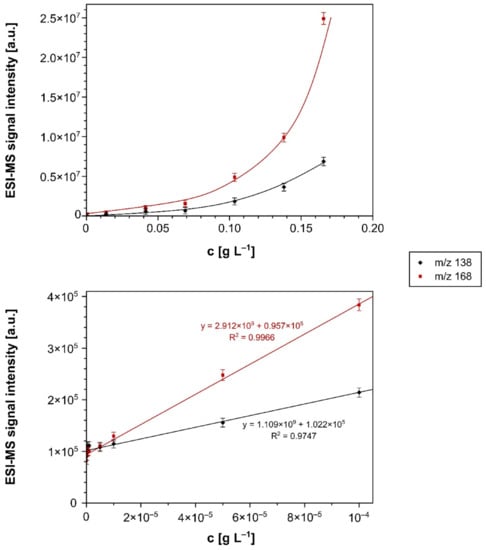The ESI-MS calibration curves for p-nitrophenol (m/z 138) and 2-methoxy-5-nitrophenol (m/z 168), performed in the two concentration ranges: 1 × 10−8 to 2 × 10−1 g L−1 (top) and 1 × 10−8 to1 × 10−4 g L−1 (bottom).