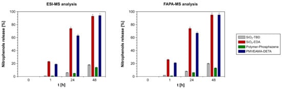 The obtained complexes (adsorbent-H+ + nitrophenolate–) may also release the studied nitrophenols from their structure, under certain conditions, into water or soil and play a role of biostimulators of cultivated plants. Therefore, the complexes of the functional materials after their incubation in the most concentrated solution of the nitrophenols (initial concentration of each nitrophenol of 1.4 × 10−1 g L−1) were subjected to release experiments. The calculated mean amount of the nitrophenols bound to the materials were 0.102, 0.089, 0.140, and 0.074 g of each nitrophenol g−1 material, for SiO2-TBD, SiO2-EDA, Polymer-Phosphazene, and PMVEAMA-DETA, respectively. It is worthy to highlight that the differences between the amount of p-nitrophenol and 2-methoxy-5-nitrophenol were rather insignificant, which was a result of the similar pKa values of these compounds, not increasing the selectiveness of their interactions with the pendant basic receptors. The nitrophenols’ release progress was monitored by two complementary methods of mass spectrometry, i.e., the ESI-MS measurements of the water solutions during the incubation of the complexes in deionized water in preset time intervals (1, 24, and 48 h) and FAPA-MS analysis of the isolated materials from deionized water in the same time intervals. The dependence of the release percentage as a function of time is presented in Figure 6.