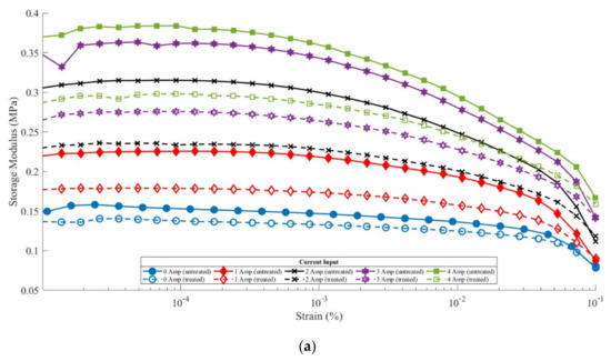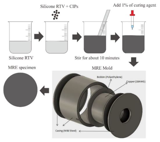 - Perales-Martínez, I.A.; Palacios-Pineda, L.M.; Sánchez, L.M.L.; Martínez-Romero, O.; Puente-Córdova, J.; Elías-Zúñiga, A. Enhancement of a magnetorheological PDMS elastomer with carbonyl iron particles. Polym. Test. 2016, 57, 78–86. [Google Scholar] [CrossRef]