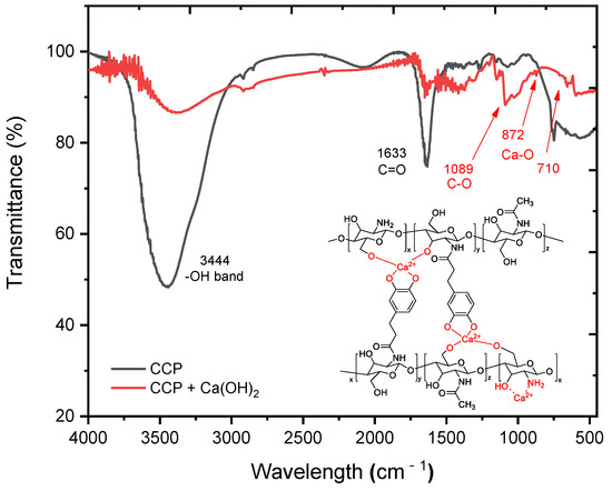 FT-IR spectra of CCP (black line) and CCP upon reacting with Ca(OH)2 (red line). The expected structure of calcium–Cat-Chit was added in the spectra.