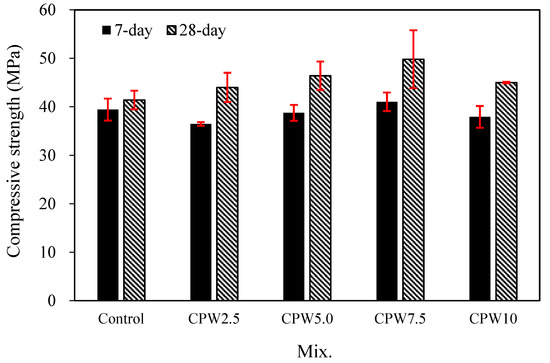 Figure 7 shows the changes in the compressive strengths of the mortars with various amounts of CPW after 7 and 28 days. After 7 days, the compressive strength of the control sample with no CPW was found to be approximately 39.4 MPa. By contrast, the 7-day compressive strength of the CPW7.5 sample was approximately 41.0 MPa, which was higher than that of other mixes and approximately 4% higher than that of the control sample.