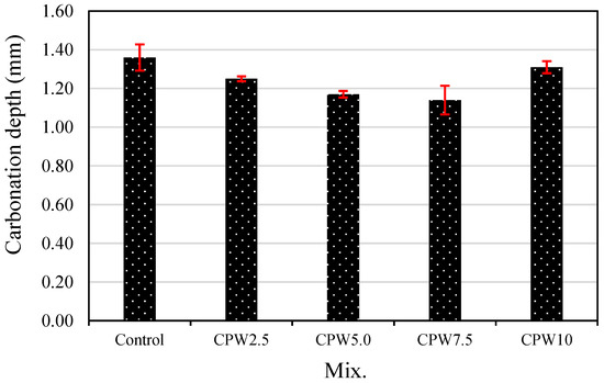 Figure 11 shows the carbonation depth after 28 days of accelerated aging of the various samples. The carbonation depth of the control sample was approximately 1.36 mm, which was higher than those of all the mixes containing CCP. In the case of samples containing 0–7.5% CCP, carbonation depth decreased as the CPW proportion increased. Particularly, the carbonation depth of CPW7.5 was approximately 1.14 mm, which was about 16% lower than that of the control sample and the lowest among all the samples. Therefore, the proper incorporation of CCP effectively improves not only mechanical properties, such as the compressive and tensile strength (Figure 8 and Figure 9, respectively), but also carbonation resistance. Taken together, these findings suggest that adding CPW makes the cement composites denser, which is known to increase compressive strength and decrease carbonation depth.