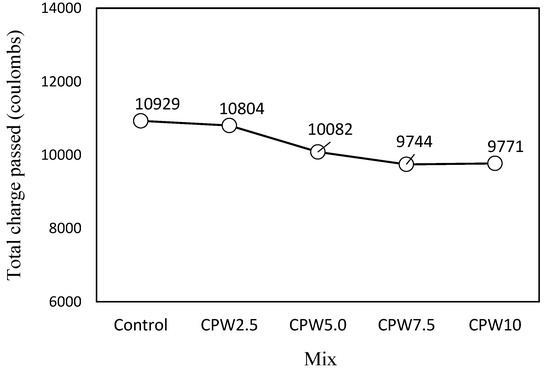 As shown in Figure 12, which illustrates the chloride-ion penetrability according to the amount of CPW, the total charge passing through the control mixture was the highest at approximately 10929 C. For the CPW2.5 sample, this value was slightly lower, and it continued to decrease with an increasing amount of CPW up to CPW7.5, which had a similar value to CPW10, (9744 and 9771 C, respectively). Therefore, the use of CCP is expected to improve the resistance of cement mortar relative to chloride-ion penetration.