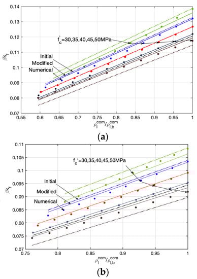 Through a regression analysis, the relationship between the equivalent neutral axis depth and the relative mechanical reinforcing index can be approximately evaluated by Equations (19) and (20), and demonstrated by the dotted lines (the initial ones) in Figure 4a–c.