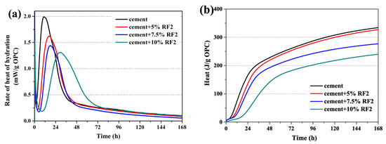 Heat of hydration of OPC-RF2: (a) rate of heat of hydration and (b) total hydration heat.