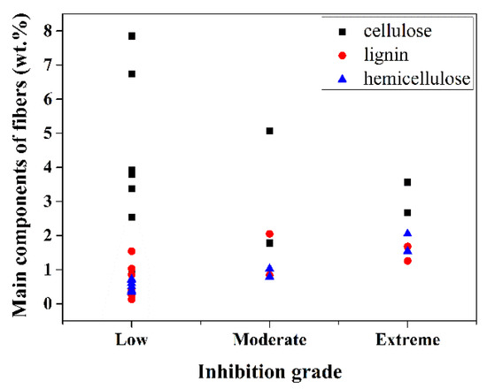 A diagram of the inhibition grade versus the content of hemicellulose, lignin and cellulose is shown in Figure 6. The figure shows that the content and change of hemicellulose had the most significant effect on the inhibition grade. The inhibitory grade reached the extreme grade when the hemicellulose content was 1.54 and 2.05 wt.%, while the hydration of OPC was stopped when the hemicellulose content was 2.05 wt.%. Thomas and Birchall [37] deem that the extractives of plant fibers adsorb Ca2+ ions, slowing the OPC hydration. Therefore, the extractives of plant fibers are involved in free calcium sequestration in the process of hydration of OPC and change the formation process of the hydration products, leading to composites with lower mechanical properties. Thus, the influence of RF1 on the hydration of OPC is in agreement with results reported by Olorunnisola [38] for rattan. Kochova et al. [39] investigated the effect of pure saccharides and the leachates of six natural fibers on the hydration of OPC, and they found that glucose, mannose and xylose in fiber leachates slowed down the cement hydration. In addition, cellulose is the least influential factor in the hydration of cement among the three main components, as shown in Figure 6, because 90OPC-10RF3 and 90OPC-10RF4 are in the low inhibitory grade range even if cellulose content reaches 6.74 and 7.85 wt.%, respectively. The influence of lignin on the hydration of OPC is between cellulose and hemicellulose. As far as 90OPC-10RF2 and 90OPC-10RF3 are concerned, the hemicellulose content is almost the same. However, the lignin content of 2.05 and 0.85 wt.% leads to moderate inhibitory index and low inhibitory index, respectively.