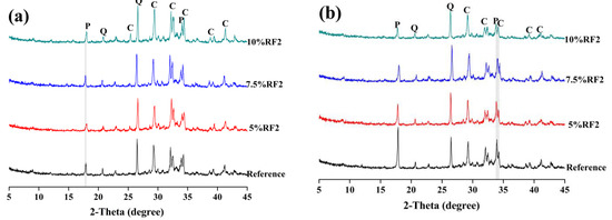 XRD patterns of OPC-RF2 at (a) 3 days and (b) 7 days (E—ettringite, Q—quartz, C-C3S and C2S, P—portlandite).