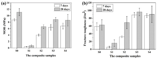 Figure 11 shows the maximum flexural strength (MOR) and fracture toughness of the composite samples with 10 wt.% RF1, RF2, RF3 and RF4 after 7 and 28 days, respectively, and a comparison with the reference sample cement paste (S0). As shown in Figure 11a, adding 10 wt.% RF1, RF2, RF3 and RF4 causes about a 95.4%, 54.0%, 26.4% and 21.8% reduction in the maximum flexural strength values of composites compared to the reference cement paste of 7 days. A similar behavior pattern is revealed for the composite samples of 28 days; compared with the reference samples, the maximum flexural strength of the composites with 10 wt.% RF1, RF2, RF3 and RF4 declines by about 84.7%, 40.5%, 20.7% and 22.5%. Moreover, the MOR values of the samples at 28 days are higher than those of 7 days. The possible reasons for the above phenomenon are as follows. Firstly, in combination with the hydration heat and XRD analysis result, addition of 10 wt.% rice straw fibers causes a delay of the hydration degree of cement. The hydration degree of cement is related to the strength of the cement, which increases with the hydration degree of the cement. This is consistent with the description of Bilba et al. [36], which suggests that hydrolysis of lignin, an amorphous substance of fiber composition, and the dissolution of hemicellulose delays or even stops the hydration process of cement, affecting the mechanical properties of cement-based composites. As a result, the maximum flexural strength of the samples with RF1 and RF2 is only 0.4 and 4.0 MPa at 7 days. Secondly, for the samples with RF3 and RF4, a small quantity of fibers could not distribute uniformly in the matrix, and some areas of the samples were without fiber, which could lead to initial cracks grown in these areas [41].
