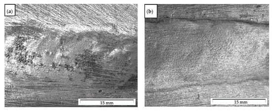 The results of the visual examination of remelting revealed a uniform weld face with some small discontinuities. This is related to the presence of pores and the inhomogeneous distribution of the reinforcement phases, mainly for SiCp (Figure 2a). A similar weld face was observed in the surface of the pad welding (Figure 2b). The weld face was smooth and uniform, which indicated the correct selection of the pad welding parameters. No pores and bladders were observed on the surface. On this basis, it was concluded that the welding filler wire for pad welding (AlSi12) increased the area of the liquid metal pool and filled the space between the reinforcing particles and the aluminum matrix better. It is also important to reduce the number of reinforcing particle units of volume of the liquid metal pool.