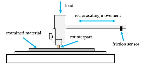 The tribological investigations were performed by reciprocating movement in ambient condition and without lubrication. A speed of 4 m/min, a load of 1.5 kg, and a distance of 500 m were applied as the main tribological parameters. The GJL300 iron was used as a typical material for a tribological partner. The counterpart was in the form of a pin with 6 mm diameter. The surfaces before testing were grinded by using sandpaper with 1000 gradation. The scheme of the device is shown in Figure 3.