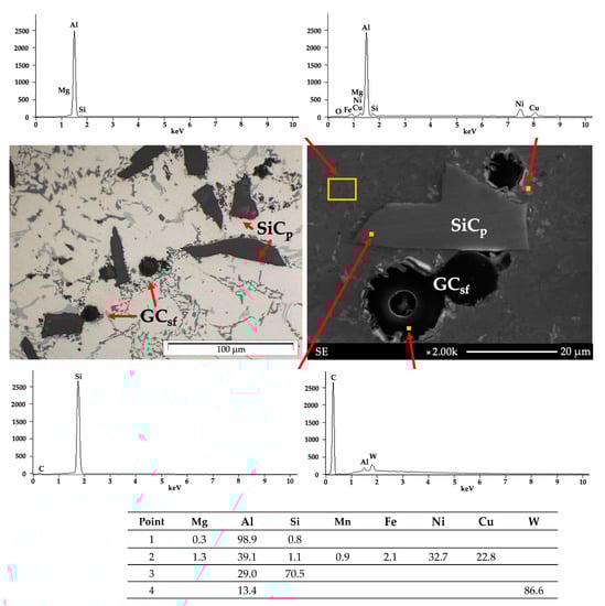 The examination of the chemical composition of the AlSi12/SiCp + GCsf composites (pt. 1) by the EDS method in individual areas revealed SiC (pt. 3) and spherical glassy carbon (pt. 4). Fe-containing phases and Ni- and Cu-containing phases (pt. 2) were also disclosed.