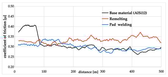 In order to determine the operating conditions of the repaired composite elements, (e.g., low-loaded pistons engines [34]), the resistance tests of tribological wear in a reciprocating system were carried out. This is a typical friction system found in compressors and reciprocating internal combustion engines. The analysis of the coefficient of friction for materials without any modification indicated that the coefficient was constant over the entire range of the experiment (over a distance of 500 m) and was on average equal to 0.33 (Figure 7). The analysis of the remelting surface showed that in the initial period (approximately 150 m), the friction coefficient increased significantly to a value of up to 0.4.