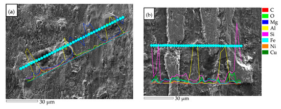 For the remelted material, slightly higher values of surface roughness parameters were obtained, Ra = 8.8 µm, Rq = 10.7 µm, and Rz = 37.0 µm, and the wear depth was approximately 130 µm (Figure 8b). This is a surface wear mechanism similar to that previously described, however, the cross-sectional profile indicates the scratching and ridging mechanisms. The profile of the worn surface depends on the behavior of individual SiC particles (Figure 8b). In the remelting process, the friction effect is reduced. It should be stated that the remelting of the composite surface does not yield a positive result for research.