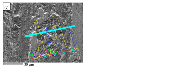 SEM–EDS line analysis after tribological test: (a) base material (AlSi12/SiCp + GCsf); (b) remelting area; (c) pad welding area.