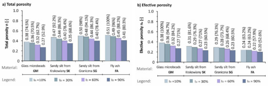 Other important characteristics of soil materials in the case studies were total porosity, effective porosity, total shape index and specific surface area—see Table 1. Minimum total porosity of 0.27 was observed in the first anthropogenic soil (GM) at density index (ID) 90%, and maximum total porosity of 0.51 was reported in fly ash at density index 10%. Minimum effective porosity of 0.20 was observed in FA at density index 90%, and maximum effective porosity of 0.38 was reported in GM at density index of 10%.