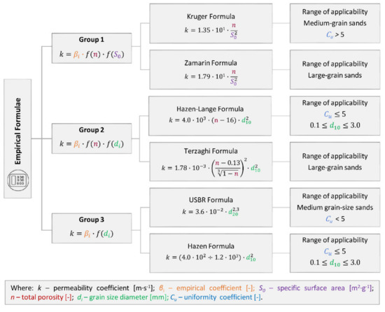 The authors divided the empirical formulae available in the literature into three groups and selected one formula from each group that could be applied to the studied soils. The three applied methods of empirical formulae (Figure 4) must be understood in a wider context of all other methods summarized in Figure 5 which also presents ones whose boundary conditions are not suitable for fine-grained soils. This context (Figure 5) shows important analogies in the calculations for each group.