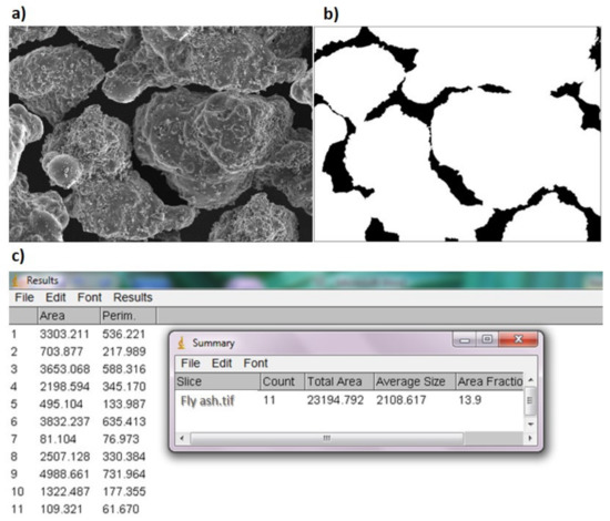 Analysis of the pore space of a single image using ImageJ software on example of fly ash: (a) output image; (b) image after transformations; (c) geometric pore parameters.