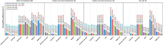 There are many methods of determining the permeability coefficient, but they may be generally divided into in-situ tests (i.e., pumping and borehole permeability tests), laboratory tests (i.e., constant water head test, falling water head test, capillary permeability test), empirical and predictive methods. Each of these groups has its advantages and disadvantages. In-situ tests return the most reliable results, however they are costly and technically difficult—erroneous results may be influenced by incomplete recognition of the geological structure of the layer. In laboratory tests, the challenge lies in preparing representative samples for testing, and sample size is limited [15,16]. Empirical formulae, which are widely used, are based mainly on the grain-size of soils and thus their use, although easy and quick, is subject to significant errors. Often these formulae, based only on grain-size diameters, do not take into account the relationship between porosity, compaction, specific surface area and permeability coefficient [17,18,19,20,21,22].