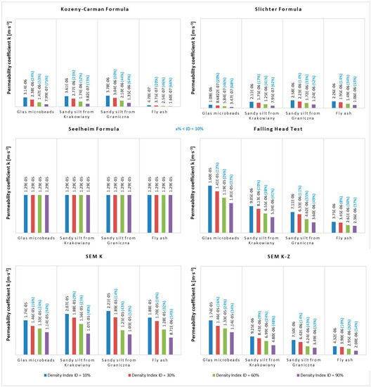 If we evaluate the values of permeability coefficient based on the different methods applied (Figure 8), the following findings are achieved. The Kozeny-Carman Formula (Figure 8a) shows a decrease in density index in all studied materials from the most compacted state to the least. This is logical because more water permeates through looser and less compacted material than through more compacted one. The difference between the least compacted state (density index ID = 10%) and the most compacted state (density index ID = 90%) was 75% in GM. On the other hand, in SK the difference was 73% and the decreasing trend continued in other soil materials, i.e., 64% in SG and 66% in FA.