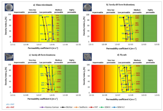 The second, less common approach is when impermeable engineering-geological environment is considered a suitable foundation soil for a given purpose. This way, the impermeable engineering-geological environment of fine-grained soils may be more suitable foundation soil. Therefore, sandy silt from Krakowiany, sandy silt from Graniczna, and fly ash are conditionally suitable foundation soils—see the yellow colour in Figure 10. All the values of these three studied soils (including the changes in density index) fell in this part of the classification graph using the reference falling head test. Only the anthropogenic soil of glass microbeads was classified as unsuitable because it was more permeable due to the grain shape.