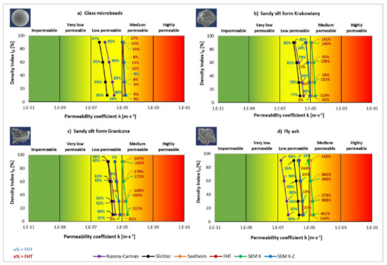 The second most suitable method was the modified Kozlowski method (SEM K-Z) (Figure 8f). Similarly to the FHT, the modified Kozlowski method reflected the physical process of soil compaction in the gradual decrease in permeability coefficient from the least compacted to the most compacted state. In addition, the method reflected the shape and material character of the soil grains. More angular grains compact in a better manner than concave grains. Thus, permeability coefficient falls from more suitable to less suitable shapes in terms of compaction.