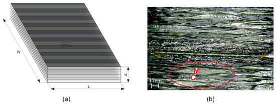 Sample: (a) Scheme with FBG sensor locations, (b) surface photograph; C—carbon fibre bundle, M—polymeric matrix.