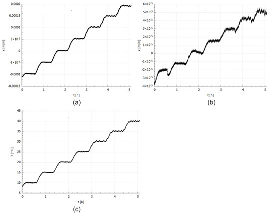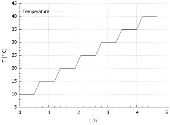 For thermal testing, the sample was put inside the environmental chamber (MyDiscovery DM600C (Angelantoni Test Technologies Srl, Massa Martana, Italy)) where the temperature was set in a range from 10 to 40 C with 5 C, increment under a stable value of the relative humidity (RH) level at 20% as it is presented in Figure 3. For the FBG sensors measurement interrogator si425-500 (Micron Optics, Atlanta, GA, USA) with a measurement frequency equal to 1 Hz was used. The temperature close to the sample was measured using an FBG temperature probe (Micron Optics, Atlanta, GA, USA). The measurement set-up is presented in Figure 1.