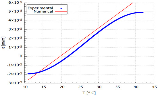 The obtained numerical results of the temperature and strain relationship were compared with the experimental data. The comparative plots are shown in Figure 6 and Figure 7. The results presented in Figure 6 are related to the exact temperature values determined from the temperature measured during the experimental test (Figure 4d) according to the procedure described for Equation (7). While the comparison presented in Figure 7 is linked with the experimental strain approximation that is burdened with 2.7% error (acc. to Equation (9)).