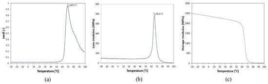 Curves obtained from DMA testing: (a) Loss factor (tan ), (b) loss modulus, (c) storage modulus.