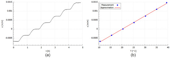 FBG sensor was placed in the middle and embedded parallelly to the main axes of the sample. The obtained strain values in the form of a function (Equation (8)) allow determining the thermal expansion. The relation can be obtained from the first derivation of strain function, thus the coefficient of thermal expansion (CTE) is also obtained.