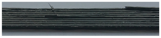 Such a conclusion can be supported by the structural degradation process observed for similar CFRP samples (also subjected to the same elevated temperatures) after the tensile test and presented in Figure 10. The only difference between the analysed sample and the tensile test samples was related to their dimensions. They had to meet the requirements of the tensile test standard. It is well visible in Figure 10 that some of the carbon fibre bundles are separated because of the debonding between fibres and matrix.