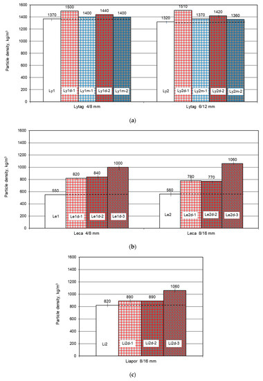 Initial moistening of LWA limited its absorption of water and cement paste. In effect, for initially moistened Lytag aggregates (Ly1m-1, Ly1m-2, Ly2m-1, Ly2m-2t), the particle density increase was as low as 2–4% (by 30-50 kg/m3). The value of this increase corresponds to that revealed in [43] for very tight lightweight aggregates.