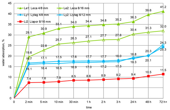 When assessing the development of water absorption of plain lightweight aggregates (Figure 7), it should be stated that during the first minutes all tested aggregates were able to absorb most of the water. For such aggregates as Leca and Liapor, characterized by the bigger difference in porosity structure between the external shell and particle interior, the ratio of water absorption after 2 min and 1 h was 72–86%. This range corresponds to the values determined in [3,12,14]. However, in the case of tested Lytag of a less diversified structure, the ratio was as high as 94–95%.