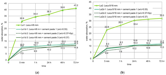 Development of water absorption in time for Leca aggregates impregnated with cement pastes: (a) Leca 4/8 mm, (b) Leca 8/16 mm.