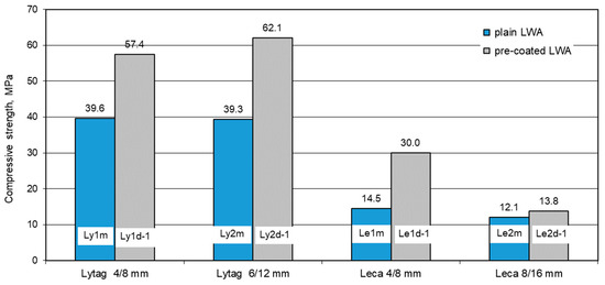 Mean compressive strength of concretes with plain and pre-coated lightweight aggregates.