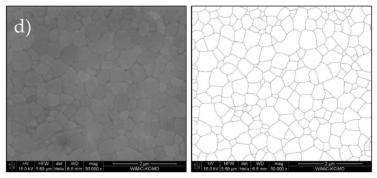 The bulk densities of the sintered bodies were measured according to the Archimedes principle in water. Their theoretical densities were calculated according to the rule of mixtures by taking into account the theoretical densities of the ATZ individual components. Prior to the hardness measurements and microscopic observations, the samples were first hand- and later machine-polished using Diamond Pads (Struers, Cleveland, OH, USA) and MD-Polishing Cloth (Struers, Cleveland, OH, USA) with 1 µm diamond paste to obtain a mirror-like surface. The hardness and KIC were examined using the Vickers indentation technique. The indentation load (applied for 10 s) was kept at 9.81 N for HV - Vickers Hardness and at 49.05 N for KIC measurements. The KIC was calculated according to the Niihara equation [27] using the length of the Palmquist cracks and indentations’ sizes. Average results were obtained from at least five measurements for every sample. The Young’s modulus was investigated by the method of ultrasonic wave velocity measurements (UZP-1, Inco-Veritas, Warsaw, Poland). Microstructures of the ATZ composites were examined on polished and thermally etched (1200 °C, 1 h) surfaces using scanning electron microscopy (Nova NanoSEM 200, FEI - Field Electron and Ion Company, Hillsboro, OR, USA). The obtained images were manually binarized with the Procreate application (version 5.1.8, Savage Interactive, North Hobart, Tasmania, Australia) and then analyzed using ImageJ (version 1.53j, Wayne Rasband, Kensington, MD, USA). Sufficiently accurate average results from measurements of at least 1000 grains were reported.