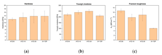 Mechanical properties of the investigated ATZ ceramics (not LTD): (a) hardness, (b) elastic modulus and (c) fracture toughness.