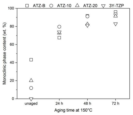 The effects of hydrothermal aging at 150 °C are displayed in Figure 3. It can be clearly seen that the transformation rate of all the specimens was very high. Our results appear to be in agreement with Hallmann et al. [13], who found that when the average grain size exceeds 0.3 μm, the zirconia-based material exhibits high rate of hydrothermal degradation and the t-m phase transformation occurred. Moreover, according to Sequeira et al. [3], it can be assumed that the greater amount of ZrO2 made the materials more vulnerable to aging. The aging curves in Figure 3 also indicated that the presence of an Al2O3 phase could delayed the t-m transformation [22].