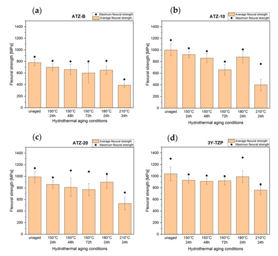 Even though the ATZ specimens showed high contents of monoclinic zirconia phase, a lower aging temperature of 150 °C (still quite high compared to typical potential applications’ environmental conditions) allowed the maintenance of relatively high strength. The tested ATZ composites withstood the difficult, demanding conditions (long time under hydrothermal conditions) quite well and low-temperature aging did not significantly affect the structural properties. The lowest relative flexural strength decreases (about 10–20%) were observed for 24 and 48 h aging times at 150 °C, suggesting that these materials are capable of operating under similar conditions for long periods of time without significant loss of strength.