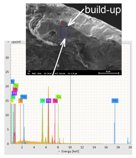 Figure 9 presents the EDS that shows that this is a build-up of DSS. The build-up of DSS determined by the EDS analyzer showing the presence of alloying components characteristic for two-phase stainless steel can be seen. There, build-up, caking and layering from DSS on the race face wear has been attached. It is worth noting that the determination of the chemical constitution (Table 4) with the EDS analyzer is very useful for determining the type of tool wear. You can define whether it is built-up, sticky or abrasion of the tool surface.