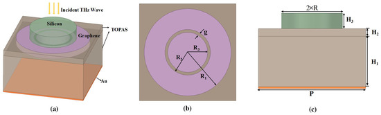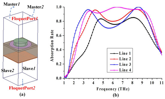 Figure 3a. The master–slave boundary conditions are set with XOZ and YOZ face. Floquet Ports are set as the excitation located at the two-sides of z-direction. The TE-polarized or TM-polarized electromagnetic wave is then exerted to define the detailed excitation. In our proposed structure, the TE mode means the component of the electric field parallel to the surface of the proposed structure (XOY plane) and the the TM mode means the component of the magnetic field parallel to the surface of the proposed structure. As shown in