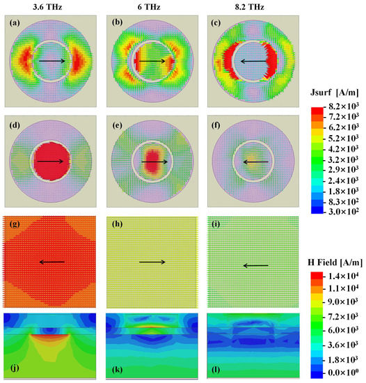 Figure 4h,i, it is obvious that the field is mainly located at the junction of the dielectric cylinder and the patterned graphene, revealing that the absorption mechanism behind correlates with GPRs highly. These phenomenons further verify the theoretical predictions before. Section magnetic field of the structure in XOZ plane is also depicted in