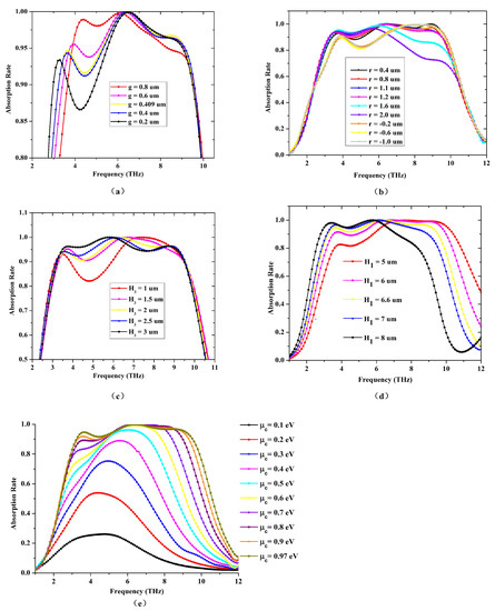 Figure 7. The first absorption peak can be individually controlled when the gap g varies while the other parameters keep unchanged. At the same time, the other two absorption peaks remain almost unchanged, as shown in