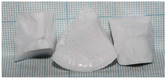 A glassy-carbon crucible (400 mL) with a weighted amount of components was heated to 750 °C with a rate of about 2.5 °C/min for 5–6 h. The melt was sustained for about 2 h at 750 °C. Then, the melt was cooled and transferred to a glovebox with a controlled atmosphere (humidity not more than 2 ppm, oxygen content 2–9 ppm). Visual observation showed that the salt had a pure white color without accessory inclusions on the surface (Figure 1).