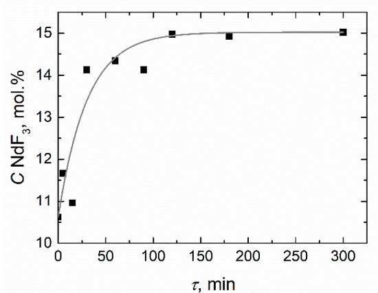 A pre-weighed amount of NdF3 was discharged into the molten salt through a nickel tube. Time of the complete dissolution of the NdF3 additive was determined according to the Nd content in the samples analyzed by ICP. Samples were taken from the central part of the crucible carefully so as not to mix the melt. The sampler was a small spoon made of nickel, allowing about 50 mg of the melt to be scooped up. The dissolution dynamics of the NdF3 addition (5 mol.%) in the molten FLiNaK containing 10 mol.% NdF3 at 700 °C are presented in Figure 4. The time of complete dissolution of the additive was about 2 h. However, the molten mixture was sustained at constant temperature for 4 h before each measurement.